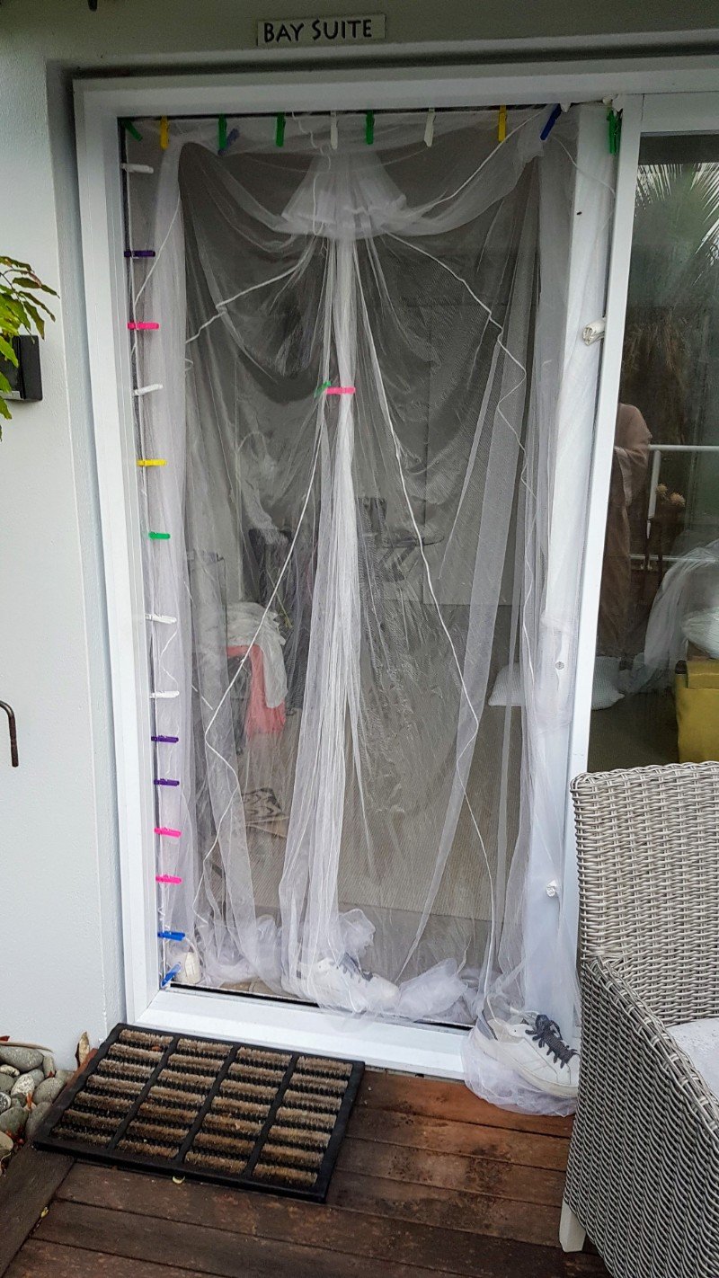 ... hat Mike gewisse handwerkliche Fähigkeiten beim Abdichten von Terrassentüren mit einem (eigentlich fürs Bett gedachten) Moskitonetz entwickelt.