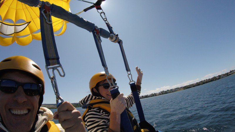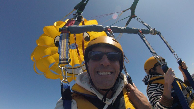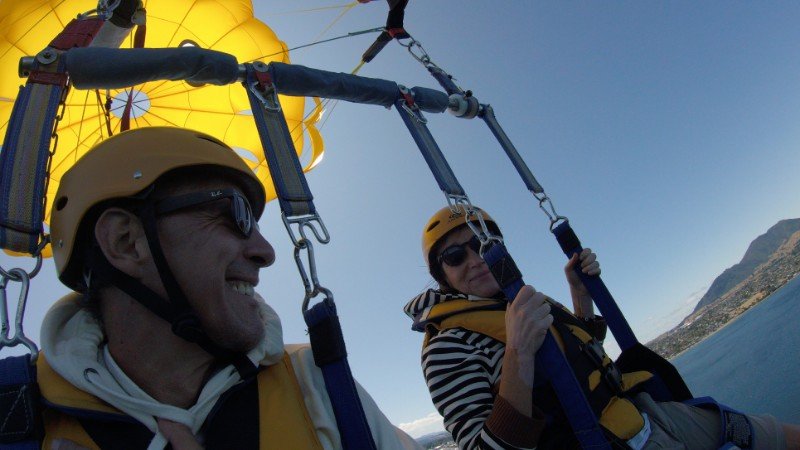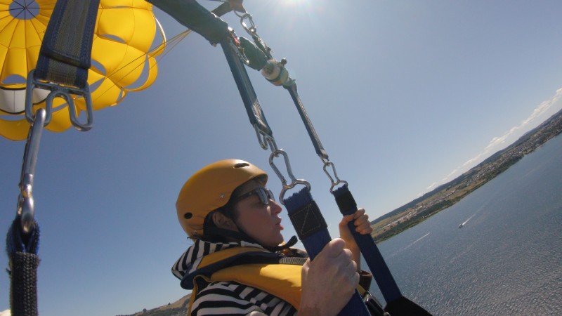 Parasailing, also sich an einem Fallschirm hängend in rund 300 Metern Höhe hinter einem Boot herziehen zu lassen, ist nicht nur ein ziemlicher Adrenalin-Kick, man hat von dort oben auch einen phantastischen Ausblick. Fast wie ein Vogel.