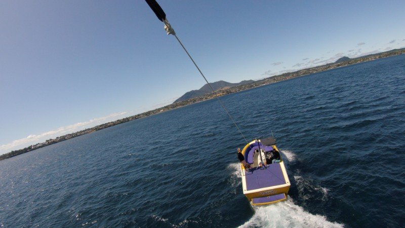 Start und Landung erfolgen dabei trocken von einem 9 Meter langen Windenboot, man kann sich aber auch einen 'Dip' wünschen, also ein Herablassen bis man mit den Füßen ins Wasser eintaucht - inkl. anschießendem 'Aufzug' zurück in luftige Höhen.