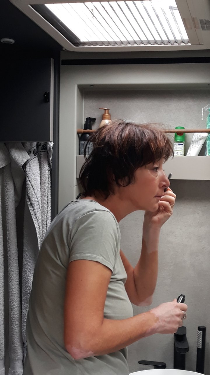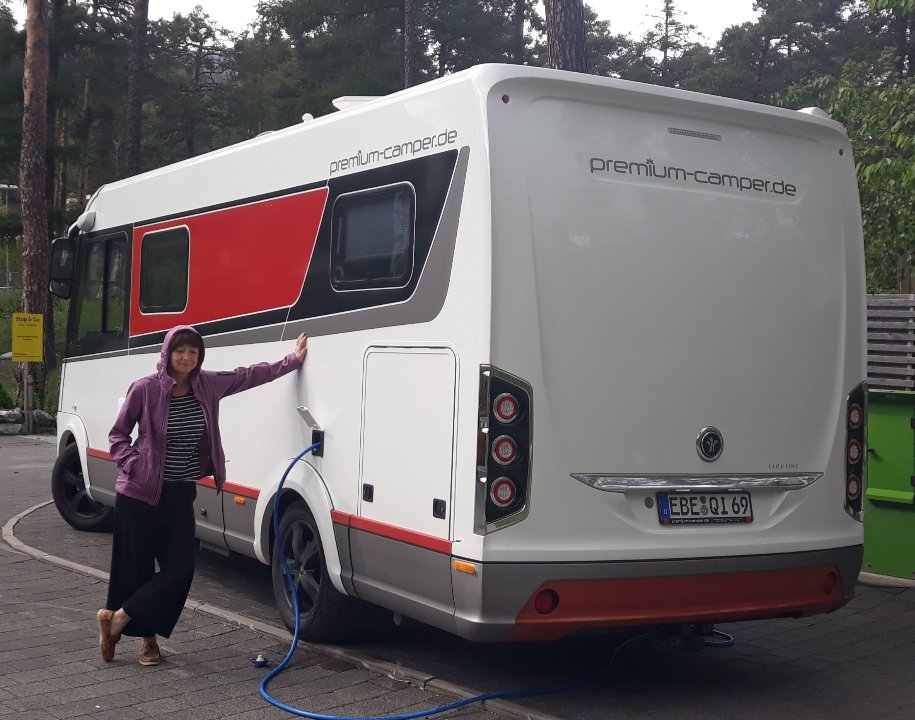 Marion beaufsichtigt das Wassertanken und passt auf, dass das Wohnmobil dabei nicht umfällt